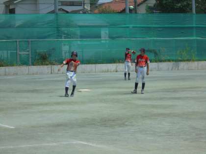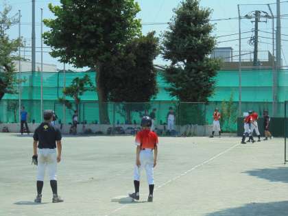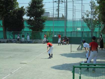 校庭では、野球部が卒業生と試合をしています。暑さの中ですが、熱中症対策を行いながら、頑張っています。