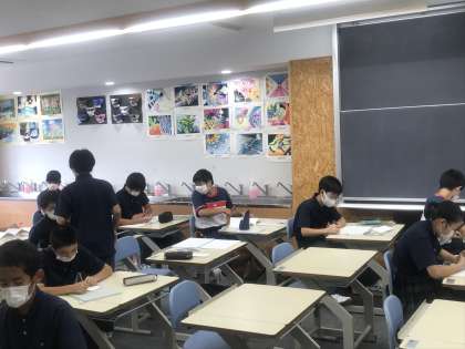 2年生の美術の時間では、夏休みの宿題の屏風絵の下書きなど一人一人しっかりと課題に取り組んでいます。(鈴木 士朗)