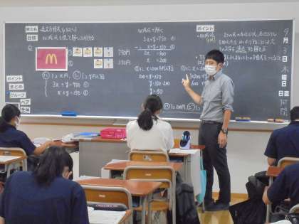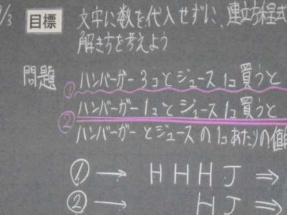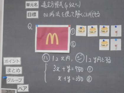 2年生の数学少人数展開の授業では、3人の先生方が「ハンバーガー」を連呼して授業を進行していました。