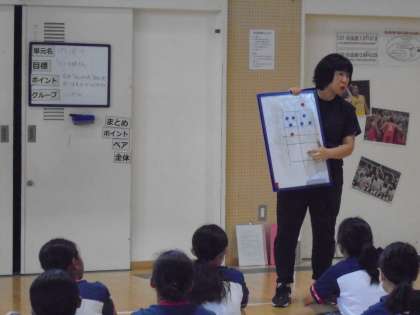 (写真は・体育館でも指示カードを使って目標確認と具体的なアドバイス・作戦タイム・ラリーの応酬場面:校長 佐野)