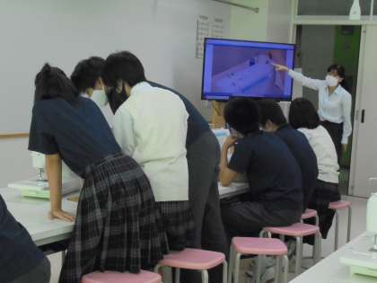 小学校での既習内容ではありますが、実際に作品「エコバック」の製作にあたり、復習する必要があると考えて丁寧に授業を進められていました。ミシンの動かし方は、動画が映しだされていて非常に分かりやすかったと思います。