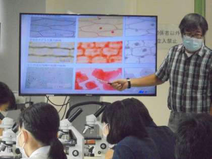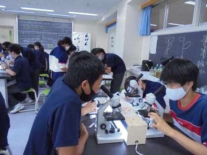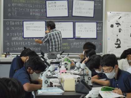 4時間目は、2年生の理科でした。理科室には一人1台の顕微鏡が設置されており、非常に恵まれた環境となっています。