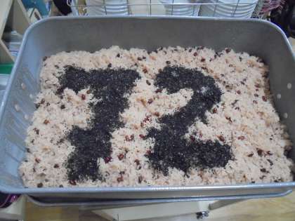 教室に運ばれたお赤飯には、ごま塩で「72」の数字が…。給食室からのお祝いメッセージでした。心のこもった美味しい給食をいただけることに感謝です。