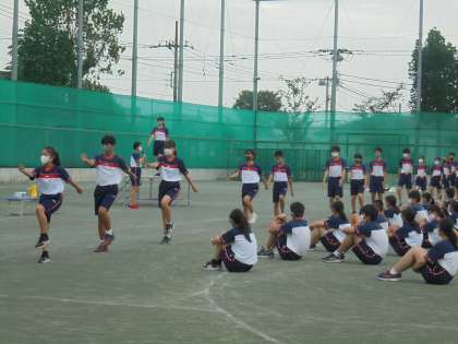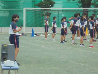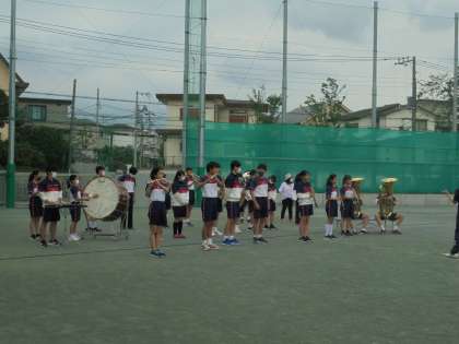 最初の練習ということで、体育祭実行委員長から、「感染症に気を付けて、全力でいい体育祭にしていきましょう」というメッセージを伝えると、大きな拍手が沸き起こりました。続く入場行進の練習も、実行委員(体育委員)全員がそれぞれのクラスの前列に立ちながら実際に行進の模範演技を行いました。行進を大きく支えてくれたのが、吹奏楽部の演奏でした。(つづく)