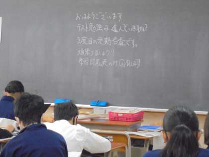 写真は本日の1時間目1年生の教室の様子です。(担任の先生からのメッセージにも注目してください。)