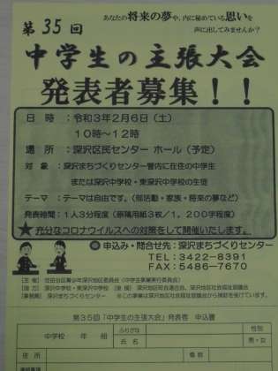 令和3年2月6日(土)10時〜「第35回 中学生の主張大会」発表者の募集についてお話がありました。意欲的に発表する生徒を大募集しています。前回の発表者からのメッセージ入りの募集用紙が本日配布されました。(写真参照)