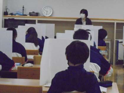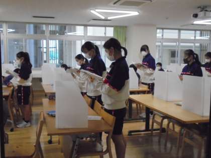 引き続き、音楽の授業は広々としたランチルームで行っており、感染防止を徹底してパーテーションを使用し、マスク着用て行っています。