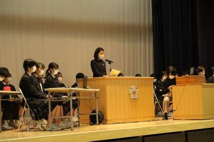 さて今日は、今まで深沢中を支えてきた3年生からバトンを受け取ることの意味を深く理解し、「志」を高く掲げてほしいと思います。言うまでもなく生徒会は全校生徒が会員です。全員が、自分の「志」は何なのかを見つめ直し、行動しようという気持ちを確認できる生徒総会になることを期待しています。