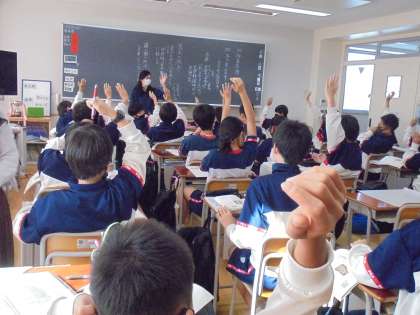 今日の1時間目、1年生の国語では、先生の発問に対して、活発な意見交換と発表活動が繰り広げられていました。