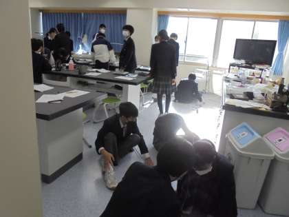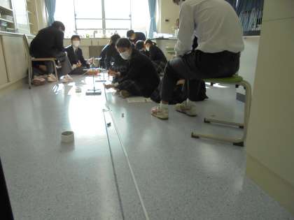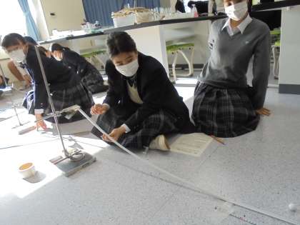 理科室では、3年生が教室の空いた空間や廊下に出て位置エネルギーの測定を行っていました。