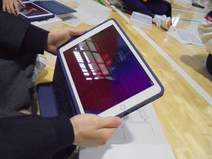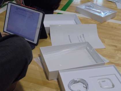4校時、体育館でタブレットの配布を行いました。一人一人に真新しいタブレットとケースが渡され、箱から取り出してケースにセットしてみると、なかなか入らなかったり、ケースがら取り出すのに苦労している生徒もいました。それぞれ丁寧に受け取るために、慎重に扱っていました。