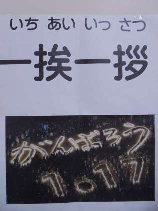 校長講話で紹介した「挨拶」の話、阪神淡路大震災の慰霊祭の写真を紹介します。また、生徒会長から「挨拶運動(19〜23日)の話」、体育委員長から「昼休みのテニスコート開放の話」がありました。