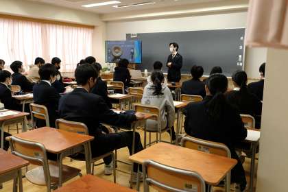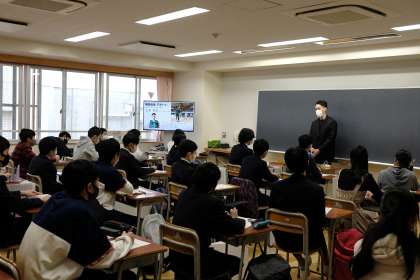 弁護士、元バスケットボールプレイヤーの方のお話の様子です。その職業についたきっかけや、生徒たちの質問にも答えていただきました。