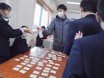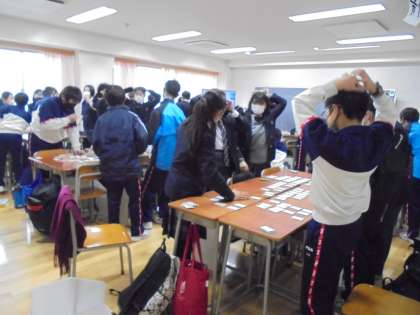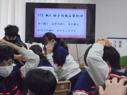 体育館で合同で実施することを変更して、感染症対策をしっかり行いながら、教室で行の「百人一首大会」となりましたが、とても盛り上がっていました。