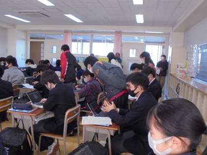 校内研修を兼ねているので、今回の授業は非常に多くの先生方が授業参観をしていました。参観した先生方は、みんな、生徒たちのipadを扱うスキルが高いことにびっくりしていました。