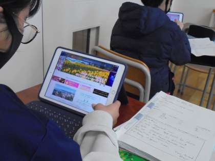 学習室の英語授業では、葉書で相手に伝える内容を作成するために、検索作業を行っていました。こちらも非常に手慣れた様子で作業に励んでいました。