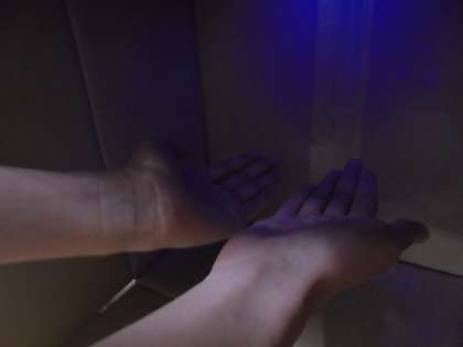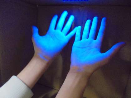 さて、今回の朝礼では、給食委員会と保健委員会による手洗い実験の動画の紹介がありました。これは委員会の生徒が、事前に洗い残しの部分が光るスプレーを手に吹きかけてから、手を洗い、水だけで洗った場合と、石鹸を使って洗った場合とを比較したものです。