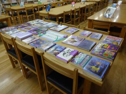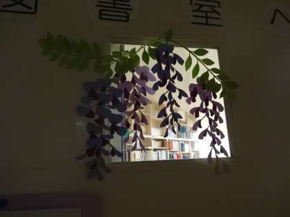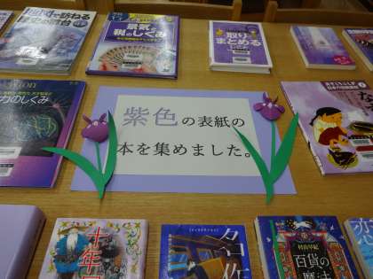 学校図書館では、藤の花にちなんで?紫色の表紙の本が勢揃い!
