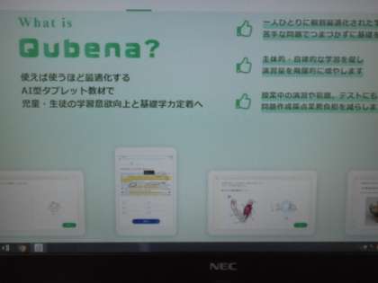 本校では、ICT機器を活用して、一人ひとりの学習をサポートし、個別最適化教育の推進を図っています。その促進を図っているのが、Qubenaという学習教材アプリです。