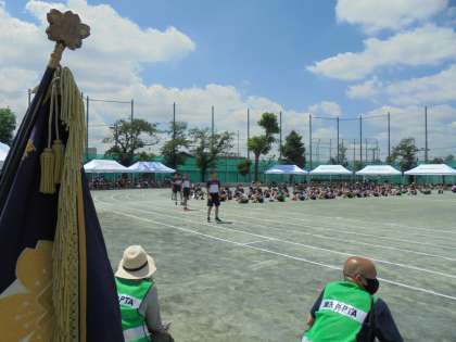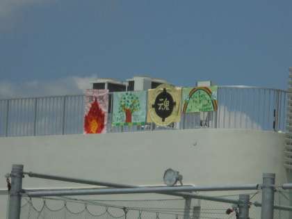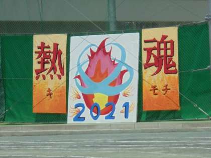 今年度のスローガン「熱魂〜キモチ」は生徒会作、シンボルマークは美術部の作となります。吹奏楽部の演奏が、入場行進や開会式を盛り上げてくれました。三年生の各学級目標も掲示されています。