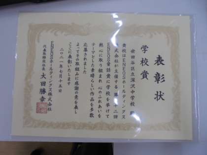 1枚目は、先日表彰された、卓球部、ソフトテニス部、バスケットボール部と並び、都大会出場を果たした野球部のメンバーの表彰の様子です。下の2枚は「エネオス童話賞」の学校賞の表彰です。文武両道、深沢中の快進撃は続きます。 (中田)