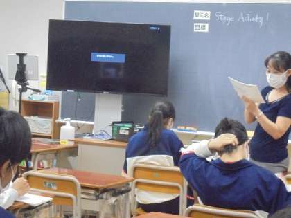 3年生の英語授業の配信風景です。教卓の前に三脚を立てて、黒板とモニターがうまく映るように調整して配信しています。