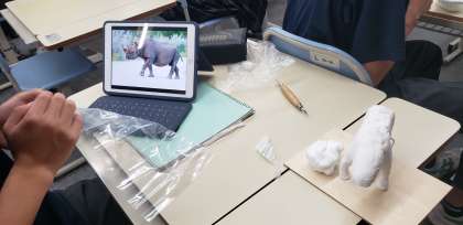 iPadで写真を見ながら動物を粘土で表現します。