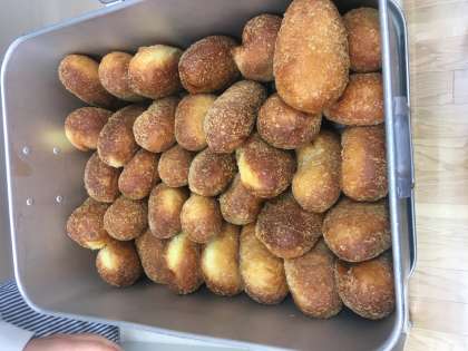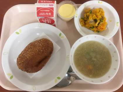 今日の給食は深沢中特製カレーパンです。作るのに手間がかかるので、学校に全学年そろっている日には作れないのだそうです。外側の生地はサクサク、中はしっとりでした!