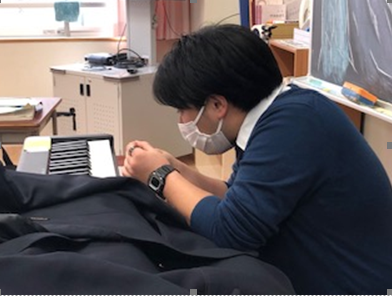 3枚目の写真、本番前にボタンが取れた生徒のブレザーのボタンを付けている担任