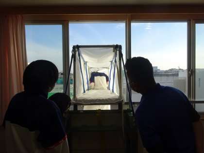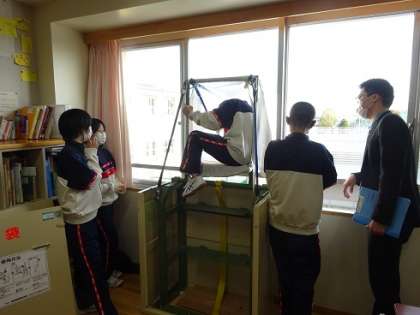 本日6校時の避難訓練では、火災を想定し、緊急避難袋を使った訓練を行いました。火災が広がり、階段が使用できない場合は、3階にある緊急避難袋を使い、外に滑って脱出します。説明があった後、各クラスの代表生徒が実際に避難袋を通り、3階から滑って地上に避難しました。万が一の時にすぐに使えるように、本日学んだことを覚えておきたいですね。