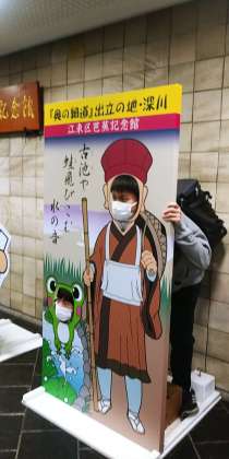 写真は、入口で芭蕉さんと記念写真を撮っている様子です。