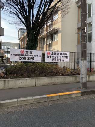 同窓会より横断幕を寄贈していただきました。ホームページではすでにお知らせしていましたが、女子ソフトテニス部の全国大会出場と吹奏楽部の東京都吹奏楽コンクールで金賞を受賞したことについての横断幕です。本校のホームページをご覧いただけない方にも生徒の活躍をお知らせすることができるようになりました。正門の右側に掲示してあります。深沢中の前をお通りの際はご覧ください。同窓会の皆様、いつも深中生の活躍を支えて戴きありがとうございます。