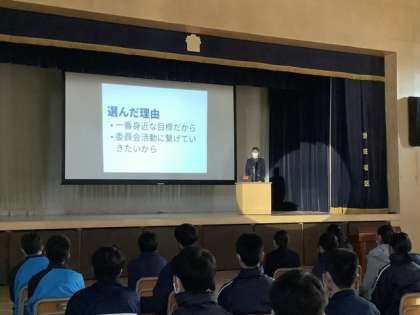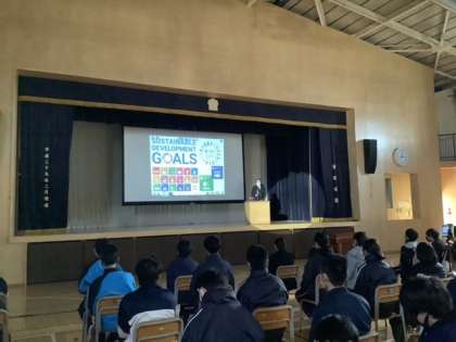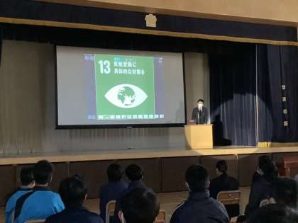 本日の総合の時間、アリーナでは、2年生による「SDGs調べ学習代表生徒発表会」が開催されました。班、そして、クラスでの発表を経て選ばれた学年代表6名。大きな舞台上の大スクリーンを使い、見事なプレゼンテーションを繰り広げていました。1年生の頃から、教科の授業や総合の時間等で多くの生徒が優れた発表を見せてくれていました。経験を重ね、鍛えられたプレゼン力に学年の先生たちもただただ感心するばかりの1時間でした。