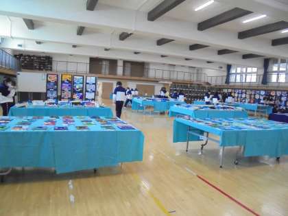 令和3年度の学芸発表会展示部門が本日をもって終了します。明日からの修学旅行の関係で、一足先に3年生の作品が片づけられています。