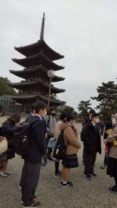 興福寺に着いて、クラスごとに集合写真を撮りました。これから、クラスを2つに分けてガイドさんに説明を受けながら、国宝館の中に入り鑑賞します。
