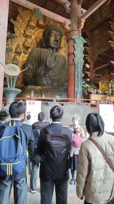 盧舎那仏(撒いて大仏様)の前で、ガイトさんの説明に耳を傾ける様子です。