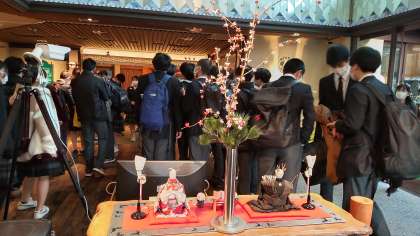 ホテルのロビーに、先発のJR京都を目指す班が集まっています。