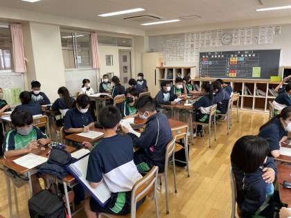 写真はいじめ防止プログラムを受けて、いじめ防止宣言を考えている様子です。全員が居心地の良いクラスになるために何が必要か、一生懸命考えています。