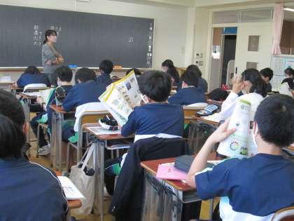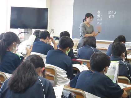 「衣服」について考えてみようということで、先生と生徒たちが意見を交わし合って進行していました。積極的な1年生の授業態度です。