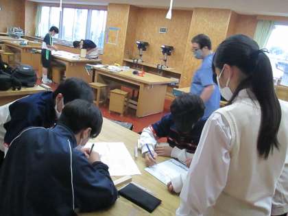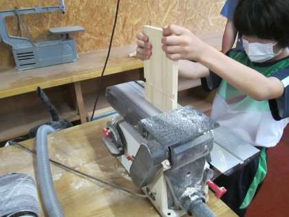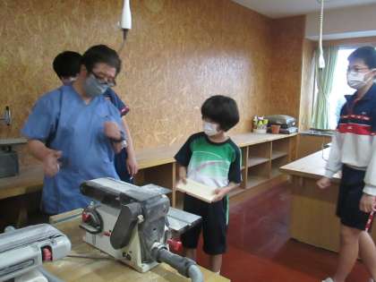 1・2年生の昇降口を挟み、木工室では技術部が真剣に作業を進め、作品製作に取り組んでいました。
