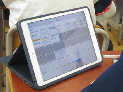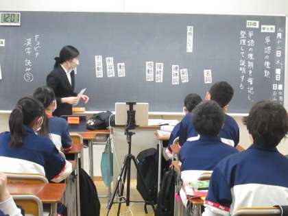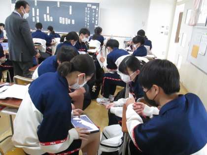 2年生の国語の授業では、文法を学びました。まず、Qubenaで5分間問題に取り組み、その後グループでの協働活動を行い、ロイロノートに提出したものを発表しました。