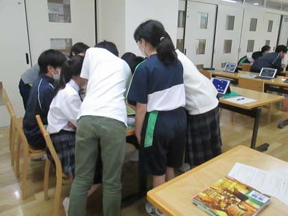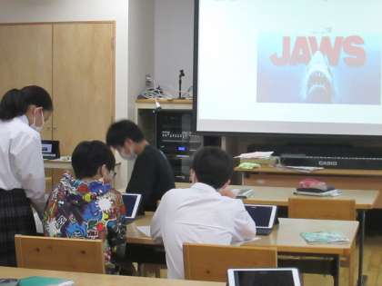 映画「ジョーズ」のテーマ曲から感じたことを思い思いに表現することができました。ロイロノートには、班ごとの色分けが分かりやすく、みんなどんどん発表内容を提出しています。