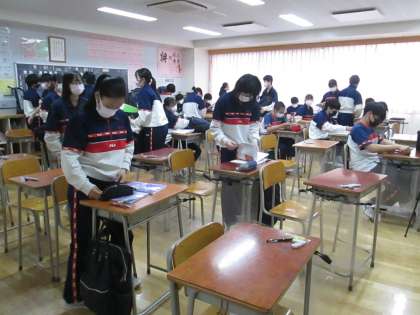 先週の1時間目を5日間かけて、英語・国語・社会・数学・理科と実施して、金曜日に5教科全ての実施が終了しました。3年生の皆さん、お疲れさまでした。