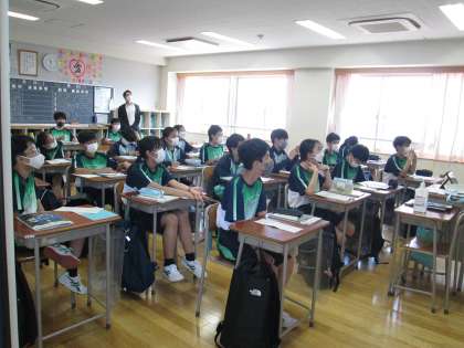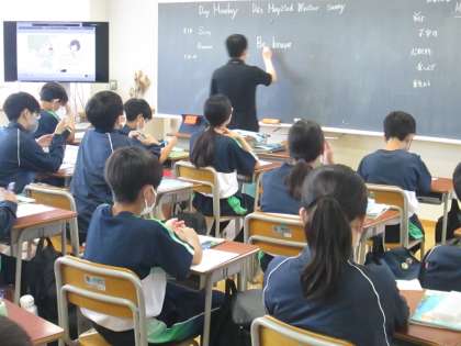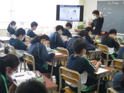 こちらの教室では、ALTの先生とともに、授業が進行していました。1年生から、ほぼオールEnglishで進む授業です。