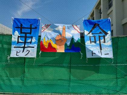 校庭には、美術部作のスローガンが飾られています。
