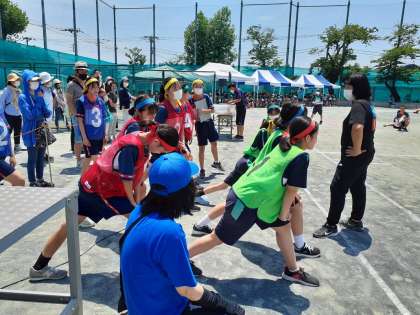 長距離が始まります。選手が皆さん、スタート前の準備体操で怪我の防止を行います。