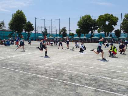 1年生女子のリレーです。アンカーにバトンを渡しました。