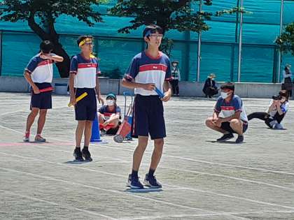 次は、3年生男子リレー選手紹介です。走り終えた女子の選手から、声援が飛びます。