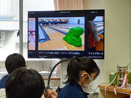 実験が終わり、各自がまとめの作業に入ります。ボーリングでたくさんのピンを倒すにはどうしたらよいかアドバイスしています。