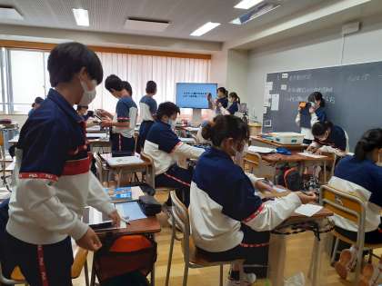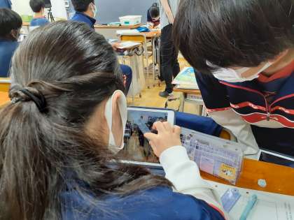 教室の場面を写真で撮って、一点透視法でスケッチすることに。iPadの新たな機能を見つけた生徒の試みに、Appleの方々が注目していました。